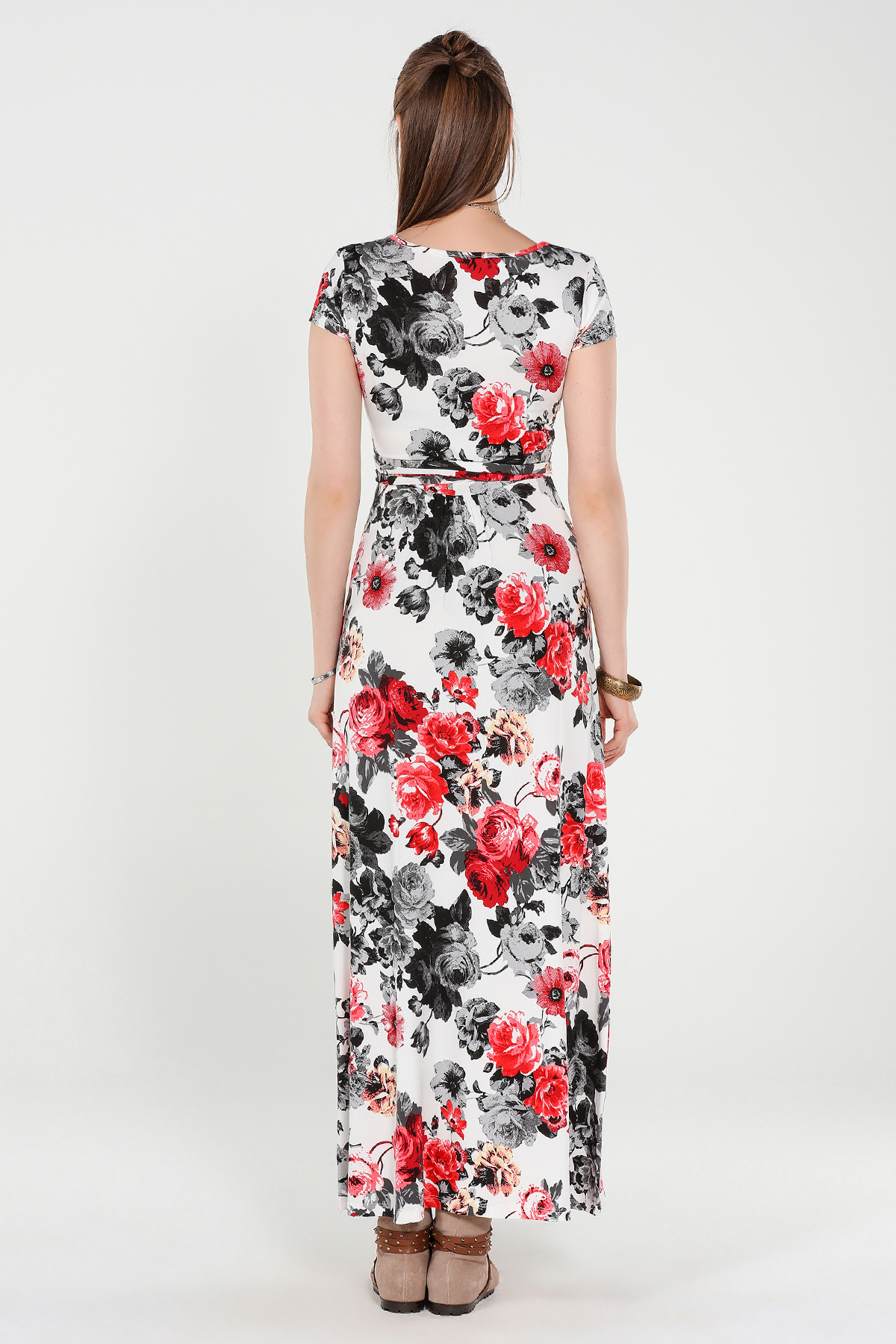 Ekru Çiçekli Kruvaze Yaka Kısa Kollu Elbise
