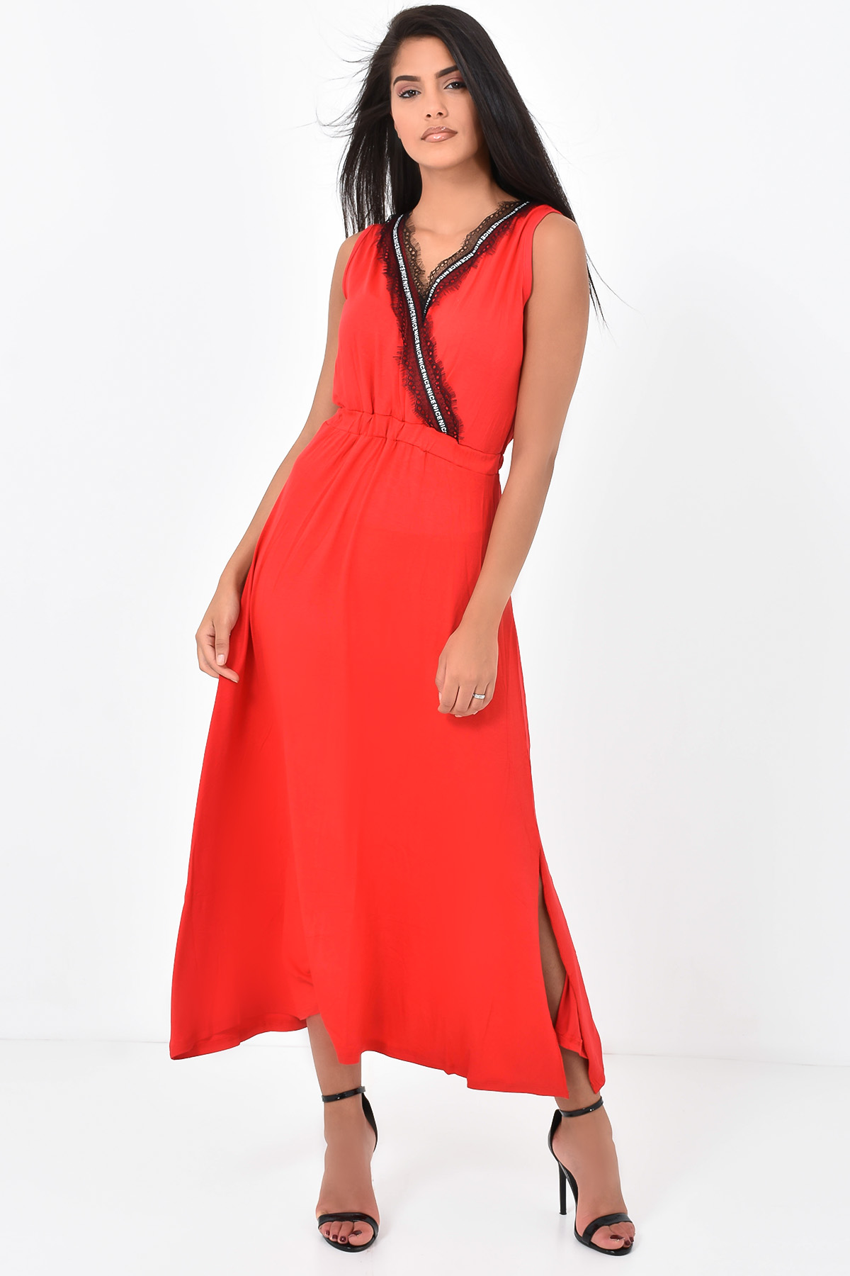Kırmızı Kruvaze Yaka Bacak Yırtmaçlı Elbise